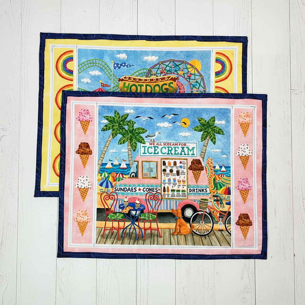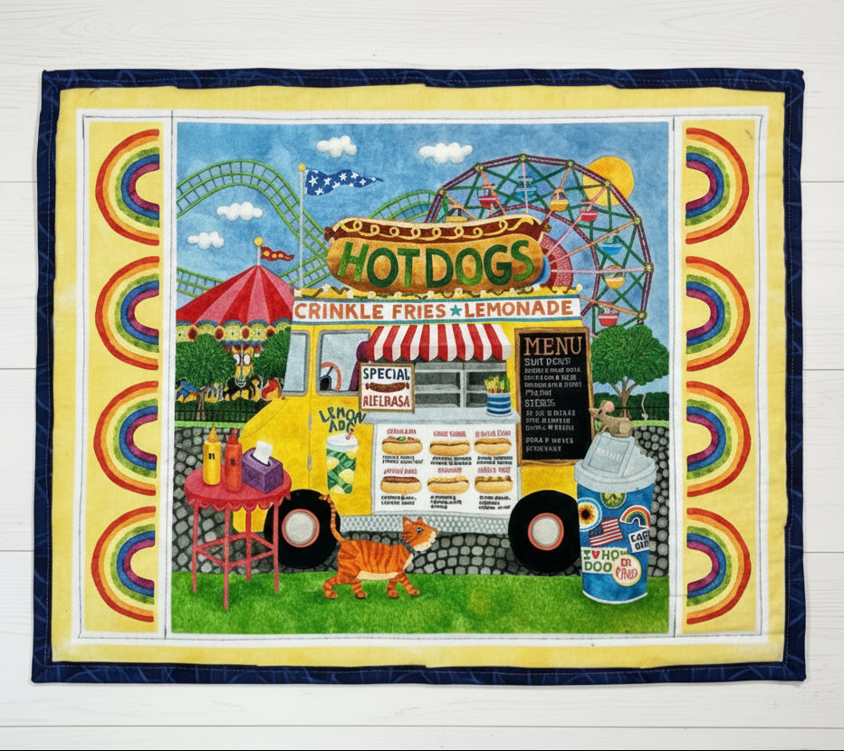 Celebrate mealtime with these charming food truck-themed placemats, featuring playful designs of hot dogs, tacos, and ice cream. Crafted from premium quilting cotton using traditional quilt construction—complete with batting and backing layers—each placemat measures a generous 18"x14", making them ideal for place settings or as striking table centerpieces.