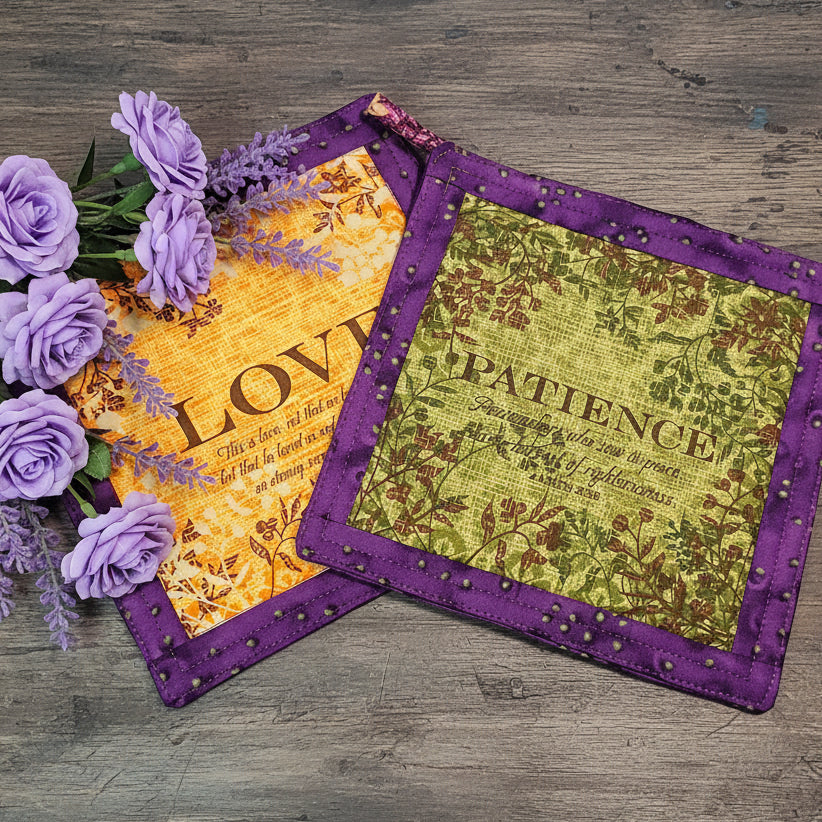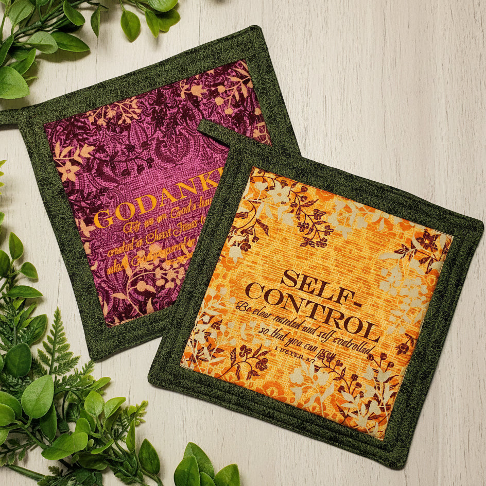 Handcrafted cotton hot pads/potholders designed with the Fruits of the Spirit as stated in Galatians 5 ("But the fruit of the Spirit is love, joy, peace, forbearance, kindness, goodness, faithfulness, gentleness and self-control"). Each set includes two pieces individually designed and measures 8 x 8"or more — ideal for gripping or placing on tables as trivets. Constructed with 100% cotton exterior and layered cotton and heat-resistant batting for reliable thermal protection. Machine washable and durable for years of use. Pattern placement varies slightly with each piece, adding to their artisanal character. Heat-resistant construction requires careful handling with extremely hot cookware; not suitable for microwave use.