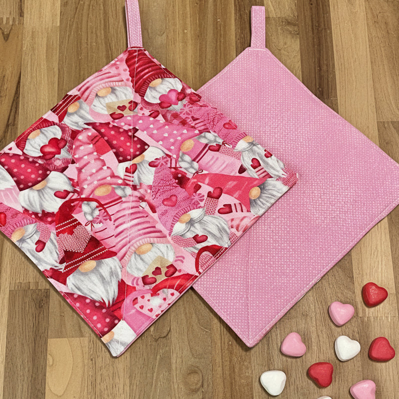 Handcrafted cotton potholders designed with love for the Valentine's Season, featuring hearts, gnomes and practical functionality. Each set includes two pieces, sized between 7" and 9"—ideal for gripping or placing on tables as trivets. Constructed with 100% cotton exterior and layered cotton and heat-resistant batting for reliable thermal protection. Machine washable and durable for years of use. Pattern placement varies slightly with each piece, adding to their artisanal character. Heat-resistant construction requires careful handling with extremely hot cookware; not suitable for microwave use.